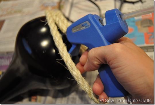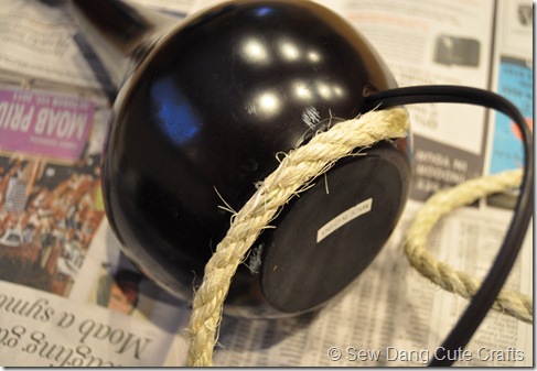 1. lépésként egy vastag kötélre és ragasztópisztolyra van csupán szükség. Lentről felfelé haladva ragaszd a kötelet a lámpatestre.