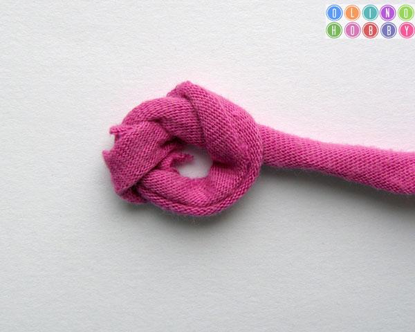 Először is vágd fel csíkokra a pólóanyagot ügyelve, hogy keresztezd a szálirányt. Majd gombolyítsd fel, így könnyebben kezelhetők.